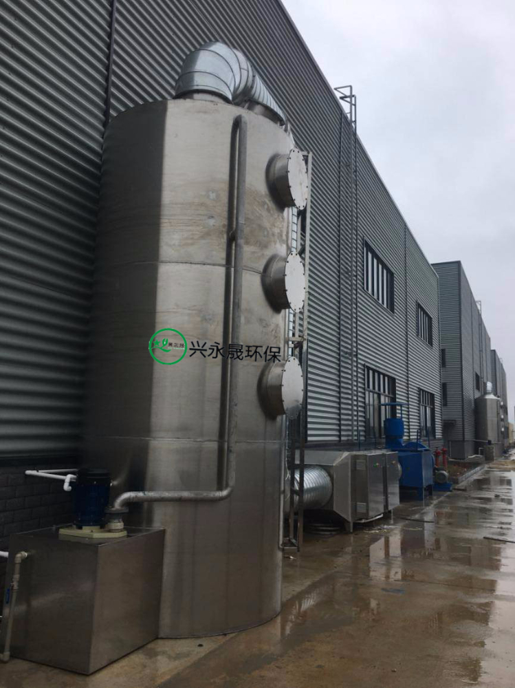 風(fēng)管 —— 風(fēng)機 —— 空氣吸入 —— 水擊式除塵 —— 噴淋+填料 —— 光解 —— 除霧 —— 活性炭吸附 —— 活性炭再生 —— 煙囪高空排放